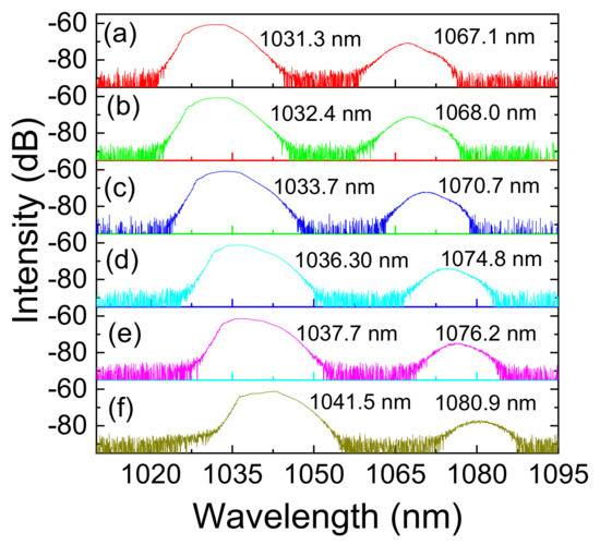 Figure 3a, we can see that the central wavelengths of the dual-wavelength ANDi fiber laser are 1031.3 nm and 1067.1 nm, which correspond to that of the Sagnac loop with 1031.8 nm and 1065.5 nm, respectively. The dual-wavelength lasers with the full width at half maximum (FWHM) are 8.1 nm and 5.5 nm, respectively. The shape of the dual-wavelength with DSs laser is approximately Gaussian-like, which is one of the typical characteristics of ANDi fiber lasers [