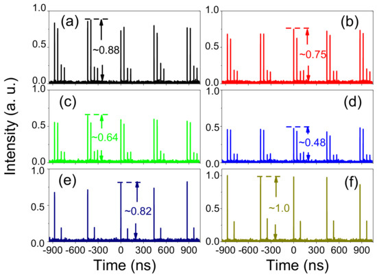 Figure 5e,f, we can see that by adjusting the wave plates to change the SA in the cavity, the intensity of the single-pulse DS in each wavelength is increased from ~0.82 to ~0.1, and the outputs power also increase from 45.0 mW to 48.5 mW. Continually changing the SA, the twin-pulse DSs will be obtained again by adjusting the waveplates. It is caused by the phenomenon of energy quantization in the laser system. Therefore, From
