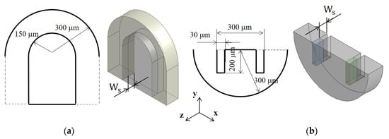 Figure 1 shows the two mixing units to be submerged: circular passage and rectangular baffles in a semi-circle mixing unit. The Norman window shown in Figure 1a has a thickness Ws in the transverse direction, and it results in a circular passage submerged along the micromixer wall. The rectangular baffles shown in Figure 1b allow the fluid flow over the short rectangular baffles and generate another flow passage at the end of baffles. The height of the submerged structure, , is optimized in terms of the DOM at the outlet.