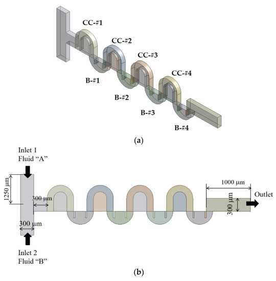 In this paper, the present micromixer was simulated by using the commercial software ANSYS® Fluent 2020 R2, Canonsburg, PA, USA [31]. The mixing performance was estimated in terms of the degree of mixing (DOM) and corresponding mixing energy cost (MEC) and was compared with those of uncombined micromixers.