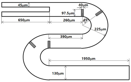 To validate the present numerical approach, a passive micromixer tested by Tsai et al. [19] was simulated. Figure 3 shows a schematic diagram of the micromixer. The cross section of the two inlets is a rectangle of width 45 μm by depth 130 μm. The micromixer has four baffles of width 40 μm by height 97.5 μm along the circular passage. The fluid was assumed to have the properties of 997 kg/m3 density, 0.00097 Ns/m2 viscosity, and 3.6 × 10−10 m2/s diffusion coefficient, as reported by Tsai et al. [19]. A set of numerical simulations was carried out for three different Reynolds numbers: Re = 1, 9, and 81. The simulation results were compared with the corresponding experimental data.