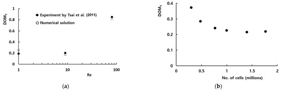 The computational domain was meshed with hexahedral cells that were fully structured. Before detailed simulations, a preliminary study was carried out to check the grid independence of numerical solutions for the Reynolds number of 9. Figure 4a shows how the numerical solution depends on the number of cells for Re = 9. When the number of computational cells is larger than about 1 million, the numerical solution shows a reasonable accuracy. Here, DOMT stands for the degree of mixing defined by Tsai et al. [19] in the following way: