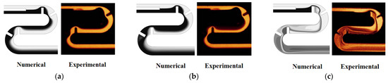 Comparison of numerical concentration distribution with experimental images of Tsai et al. [19]: (a) Re = 1, (b) Re = 9, and (c) Re = 81. Reprinted with permission from [19].