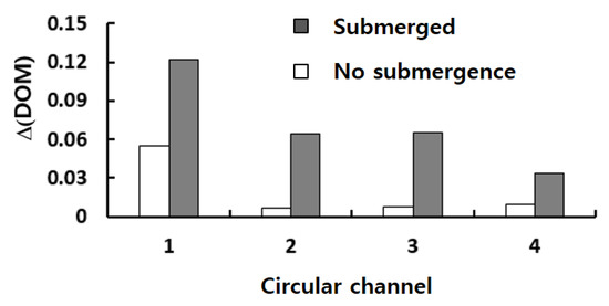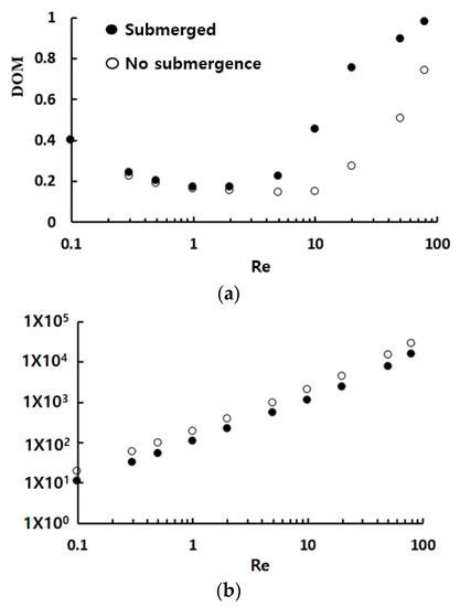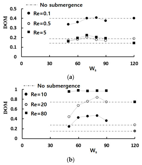 Figure 7 shows how the amount of submergence affects the mixing performance in terms of the effects of the height of submerged structure Ws on the DOM. The broken horizontal lines in the figure indicate the DOM obtained without any submergence. The DOM shows a great dependence on the height of submerged structures, and it is more significant in the mixing regime of convection dominance; approximately . Particularly noteworthy is the fact that the optimum of submergence exists for the Reynolds numbers . It is almost constant regardless of the Reynolds number and is about one-third of the channel depth. It corresponds to about 80 μm as the height of submerged structure.