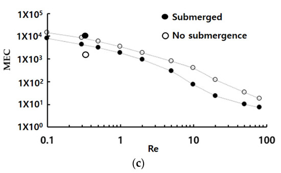 Mixing enhancement of submerged structures: (a) DOM vs. Re, (b) ΔP vs. Re, and (c) MEC vs. Re.