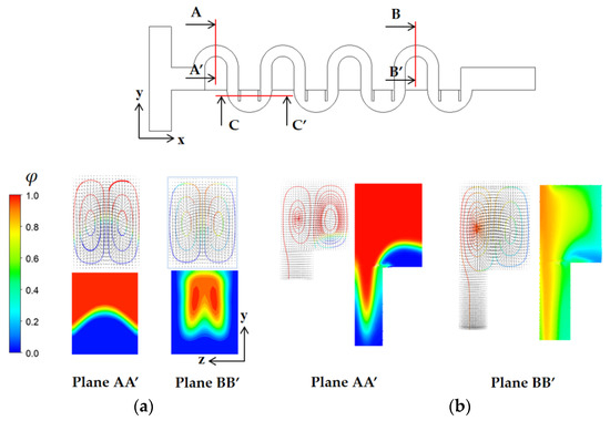 Comparison of mixing evolution along the micromixer for Re = 10: (a) No submergence, (b) Submerged, Ws = 60 μm.