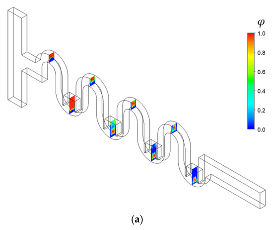The governing Equations (1)–(3) were solved using the commercial software, ANSYS® FLUENT 2020 R2, Canonsburg, PA, USA [31], which is based on the finite volume method. The convective terms in Equations (1) and (3) were discretized using the QUICK scheme (quadratic upstream interpolation for convective kinematics), and its theoretical accuracy is third order. The velocity distribution at the two inlets was assumed uniform, while the outflow condition was specified at the outlet. All other walls were treated as a no-slip boundary. The mass fraction of fluid A was specified φ = 1 at inlet 1 and φ = 0 at inlet 2.