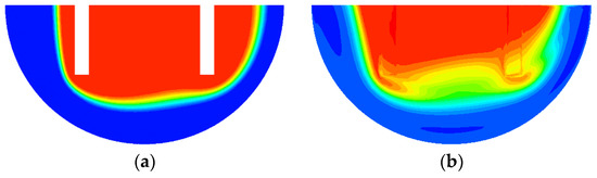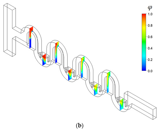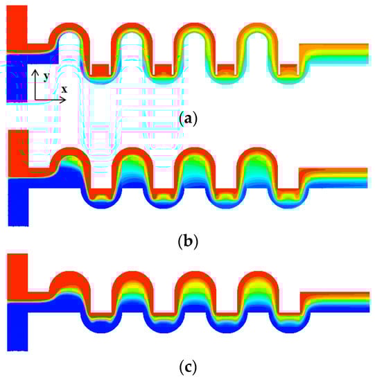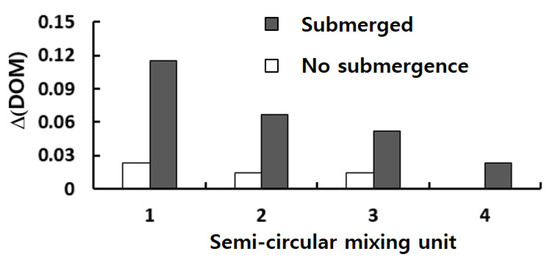 A similar improvement of DOM is observed in the semi-circular mixing unit with submerged rectangular baffles. Figure 11 shows projected streamlines and concentration distribution on the cross section CC’; refer to the cross section CC’ in Figure 8. Figure 11a shows that the submergence of baffles generates a vortex behind a baffle in the y-direction, and it causes additional mixing in the z–x plane. This vortex flow promotes the mixing around the second baffle as can be seen in Figure 11c. Comparing Figure 11c with Figure 11b, a strong mixing in the z-direction is observed as a thicker and wider interface between the two fluids before and after the baffles. Figure 12 compares the increment of DOM in each mixing unit of submerged rectangular baffles and shows a noticeable effect of baffle submergence on the DOM. For example, the DOM increment in the first mixing unit for the submerged case is 94% larger than that for no submergence case. Figure 13 compares the concentration distribution in the first semi-circular mixing unit on the plane of half-depth. The flow for the submerged case appears as a wider and wavier interface between the two fluids as it passes over the submerged baffles. This flow pattern promotes the mixing in the transverse direction, and it is confirmed quantitatively as can be seen in Figure 12.