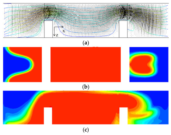 Projected streamlines and velocity vector on the three cross sections for Re = 10 structures: (a) Projected streamlines for the submerged case, Ws = 60 μm, (b) Concentration distribution for no submergence case, and (c) Concentration distribution for the submerged case, Ws = 60 μm.