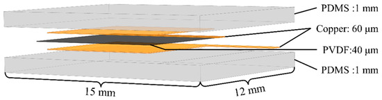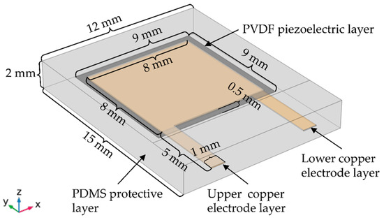 In order to simulate the tactile function of human skin, we had tried to construct several structures with different shapes and sizes. After many simulations and careful analysis, we found that the simulation results of those structures are not as good as the structure designed in Figure 1. In Figure 1, a flexible piezoelectric tactile sensor is designed based on polyvinylidene fluoride (PVDF) material with high sensitivity, good flexibility, and high piezoelectric coefficient. Its structure mainly consists of a piezoelectric layer, two copper electrode layers, and a protective layer. The piezoelectric layer is a PVDF film with the dimension of , which is composed of a PVDF polarization film and two silver electrode layers. It can convert pressure into an electrical signal to output. The copper electrode layers are composed of a double-layer “P”-type copper electrode consisting of an area of and another area of , and its thickness is . Each copper electrode (the yellow part in Figure 1) is bonded with the PVDF piezoelectric film by conductive silver glue, and the PVDF film in the middle between the double-layer copper electrodes acts as the sensitive element of the sensor. The copper electrodes are located in the center of the PVDF film, and the vertical distance between the edge of the copper electrode and the edge of the PVDF film is to prevent short-circuit from the PVDF piezoelectric film. The protective layer is made of polydimethylsiloxane (PDMS) with the dimension of , which has good flexibility and can effectively transfer the pressure applied on the sensor to the sensitive element and protect the sensitive element inside the sensor from being damaged by the external environment. The schematic of the side view of the flexible tactile sensor with different components and layers is shown in Figure 2.