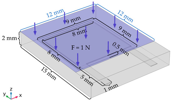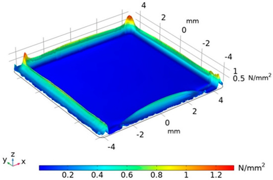 Firstly, the multiphysics simulation software (COMSOL Multiphysics) is used to construct the geometric model of the flexible tactile sensor, as shown in Figure 3. Secondly, materials such as PVDF, PDMS, and copper are assigned to each domain of the geometric model constructed for the sensor. Thirdly, the solid mechanics field is added, and the boundary conditions of the sensor are constrained; in the interface of the boundary load, a total normal force of 1 N is applied to the upper surface of the sensor model and the area where the pressure applied is 12 mm × 12 mm; meanwhile, the lower surface of the sensor is fixed in the fixed constraint interface. Fourthly, the surface boundaries of the copper electrodes and PVDF are set as free quadrilateral meshes, respectively, and the swept meshes are divided along the thickness direction; then, the PDMS domain is meshed using the refined free tetrahedral mesh. Fifthly, the equations of physical field parameters are compiled and set in the steady-state study, and the equations are solved iteratively by the solver. Finally, the stress distribution on the PVDF film surface of the simulation results is drawn, as shown in Figure 4. The color shades shown in Figure 4 indicate different stress levels of the PVDF film.
