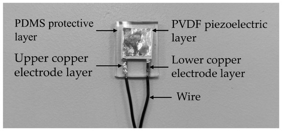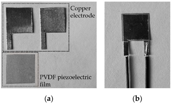 Firstly, the PVDF piezoelectric film (MEAS 1-1004346-0-M, TE Connectivity Ltd., Berwyn, PA, USA) with the dimension of is made, as shown in Figure 5a. Secondly, the PVDF film is cleaned with propanol and deionized water, respectively, so as to corrode the metal burrs on the edge of the film. This step can prevent the PVDF film from short-circuiting along the thickness direction. Thirdly, the copper electrode is made into the “P” structure, as shown in Figure 5a, and the electrode consists of a square with the area of and a rectangle with the area of . After that, the conductive silver glue (SINWE 3703, Sinwe New material Co., Ltd, Shenzhen, China) is used to connect the copper electrode, the wire, and the PVDF piezoelectric film to form an overall sensitive element. In that step, the PVDF film is placed between the two P-structure copper electrodes, the two copper electrodes are located in the center of the PVDF film, and the vertical distance between the edge of the copper electrode and the edge of the PVDF film is to prevent the PVDF piezoelectric film from short-circuiting. Then, the whole sensitive element is put into a drying oven (202-0A, Mingtu Machinery Equipment Co., Changge, China) at for to reduce the contact resistance between the copper electrode and the PVDF film. Finally, the sensitive element of the sensor is obtained, as shown in Figure 5b.