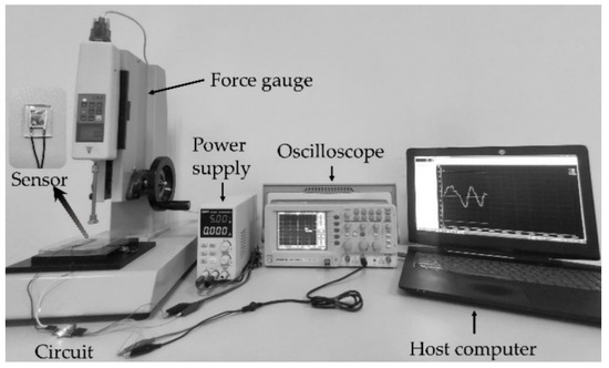 The experimental platform built in this paper mainly consists of a flexible tactile sensor, a force gauge (HP-500, Aidebao Instruments Co., Hangzhou, China), an oscilloscope (GDS-1052-U, GWINSTEK, Taiwan), etc., as shown in Figure 7. The sensor is fixed on the carrier of the force gauge shown in Figure 7, and the pressure loaded on the sensor could be converted into a voltage signal and output to the oscilloscope. To effectively filter out the interference of the power frequency signal, low-pass filtering is taken to reduce the noise of the output voltage signal, which can collect the pressure information loaded on the sensor more accurately. The calibration experiment and response time tests for the flexible tactile sensor are carried out, and the tactile signals loaded on the sensor are collected, which are the dataset for the contact pattern recognition.