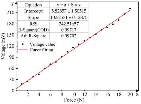 As can be seen from Figure 8, the relationship between the pressure and the output voltage of the sensor is almost linear. With the range of 0–20 N, the fitting line between the pressure and the voltage is , which means that the sensitivity of the sensor is , and the correlation coefficient is .