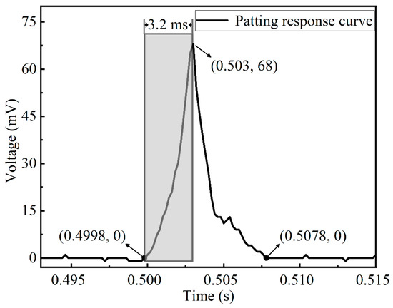 When an impact pressure is exerted on the surface of the sensor and quickly reaches the maximum value, the output charges of the sensor increased to the corresponding maximum value rapidly. The time difference in the appearance of the maximum values between the pressure and the output charges is the response time of the sensor [35]. By repeated experiments of four contact patterns (stroking, patting, kneading, and scratching) exerted on the sensor, the results show that the response time of the patting operation is , which is the minimum among those of the four contact patterns. The voltage response curve of patting is shown in Figure 9.