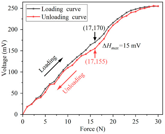 In our work, the full-scale output is 255 mV, and the hysteresis curves of the sensor are shown in Figure 10. Figure 10 indicates that = ∣170 mV − 155 mV∣, so the can be obtained as follows: