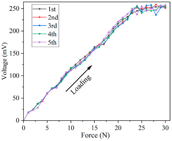 To ensure that the sensor can stably collect the accurate tactile information of the four contact patterns, the repeatability experiment of the sensor is conducted. In the experiment, the positive stroke pressure of 0–30 N is applied to the sensor with the step of , and the experiment is repeated five times, in turn, to obtain the repeatability curves, as shown in Figure 11. After calculation, it is gained that = 8.735, and then can be obtained as follows: