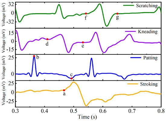 It can be seen from Figure 12 that when the tester stroked the sensor surface (the yellow curve in Figure 12), the sensor deformed by the contact pressure, and the response voltage increased gradually from point a. When the stroking pressure was removed, the sensor gradually returned to the initial state without deformation, and the response voltage returned to correspondingly. In the experiment, single patting, two-consecutive patting, and three-consecutive patting are carried out on the sensor, respectively, and the results show that the characteristics of their voltage response curves are very similar. Therefore, Figure 12 only demonstrates the typical pattern curve of the two-consecutive patting (the blue curve in Figure 12). In the process of applying patting action to the sensor, the output peak voltage is at point b. When removing the patting pressure, the sensor returns to its initial state, and the minimum output voltage is at point c. When the index finger pulp of the tester is gently kneading on the sensor surface back and forth, the corresponding output voltage changes alternately between positive and negative (from point d to point e of the purple curve in Figure 12), and its voltage amplitude is about . When the index fingernail of the tester is gently scratching on the sensor surface back and forth, the corresponding output voltage changed alternately between positive and negative (from point f to point g of the green curve in Figure 12), and its voltage amplitude is about .