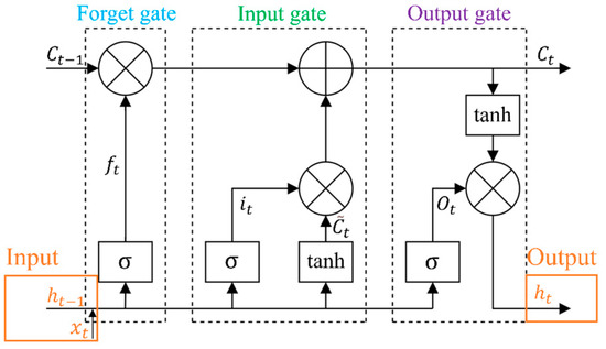 where and are the weight matrix and bias matrix connecting the IG and the input, respectively. is the forgetting coefficient obtained through IG, which is used to control the forgetting degree of the current input information. and are the weight matrix and bias matrix connecting the candidate unit and the input, respectively, and is the candidate unit generated by the tanh layer. is the update result that combines the current input information and historical information. The forgetting coefficient is obtained through OG, as shown in Formula (10), which determines the degree of forgetting of at the current moment, that is, the output at time is obtained, as shown in Formula (11):