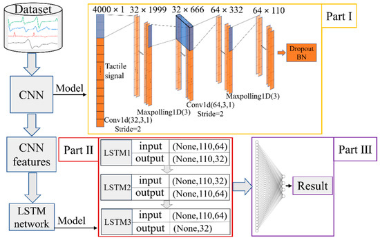 The first part of the CNN-LSTM is the feature extraction layer based on CNN, which is alternately stacked by the convolution layer and the pooling layer (as shown in Figure 14). The kernel size and number of the first convolutional layer are 3 and 32, and those of the second convolutional layer are 3 and 64. Meanwhile, the ReLU is used as the activation function of the convolutional layer. The function of the convolution layer is to extract the spatial features from the 4000-dimensional tactile time sequence signals of the input data. In order to reduce the dimension of the local spatial features, the window size of the pooling layer is set to 3. The forward operation of the input tactile signals between the convolutional layer and the pooling layer can gradually extract and fuse the global spatial features of the tactile signals. The Dropout method with a regularization function is used to improve the generalization ability of the CNN-LSTM network and avoid overfitting. At the end of the CNN, the output multi-channel feature data are mapped to the standard normal distribution by the batch normalization (BN) method, which is used as the input of the LSTM network so as to improve the convergence rate of the model.