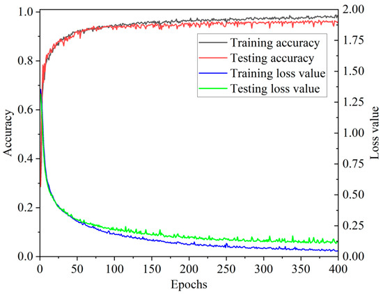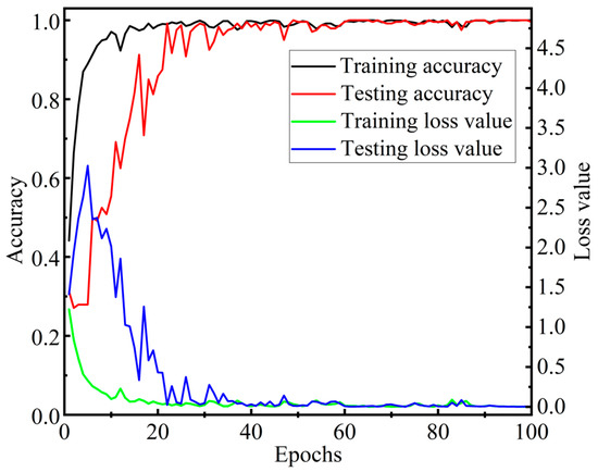 The 1200 data samples collected from the flexible tactile sensor in Section 3.5 are randomly divided into a ratio of , and they are used as the training set and the testing set of the constructed CNN-LSTM. In the training process of the CNN-LSTM model, the multi-class cross-entropy function is used to calculate the back-propagation gradient, and the Adam algorithm is used to optimize the parameters such as the weight matrix and the bias matrix. To avoid large deviation samples appearing in the training process and to speed up the iteration rate of the network, a sample set with a batch size of 32 is used to optimize the parameters; that is, 32 samples are put into the CNN-LSTM network each time. The training set and the testing set are trained and tested for 100 iterations, respectively. Finally, the loss function value and the average accuracy of the four-contact pattern recognition for each iteration are obtained, which are shown in Figure 15.