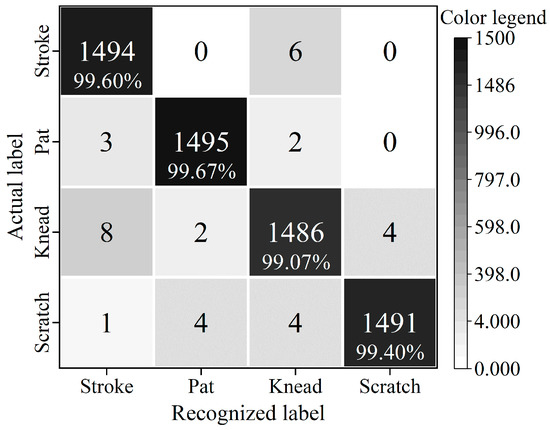 Figure 16 denotes that the recognition accuracies of the four contact patterns (stroking, patting, kneading, and scratching) based on the CNN-LSTM model are 99.60%, 99.67%, 99.07%, and 99.40%, respectively. In particular, the recognition accuracy of patting is higher than those of the others. The main reason is that the response voltages of stroking, kneading, and scratching alternate between positive and negative, while the response voltage of patting rises and falls rapidly, which makes it easier for the CNN-LSTM model to extract the tactile features from the patting operation. In the experiment, the response voltages of stroking alternate between positive and negative within a time span of about (shown in Figure 12), which is almost twice as much as that of kneading and scratching. Therefore, it is easier for the CNN-LSTM model to obtain the feature of stroking in the time dimension when processing tactile sequence signals, and that makes the recognition accuracy of stroking higher than that of kneading and scratching. All of the results imply that the CNN-LSTM constructed in this paper has fairly good performance in recognizing and classifying the four contact patterns for the flexible tactile sensor.