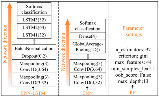 To further verify the efficiency of the CNN-LSTM model for recognizing the stroking, patting, kneading, and scratching patterns applied to the flexible tactile sensor, the CNN model and the random forest (RF) algorithm model are constructed to recognize the four contact patterns based on the same dataset as those for the CNN-LSTM model. Their basic structures are shown in Figure 17.