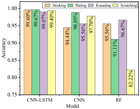 The recognition accuracies of the four contact patterns based on the CNN-LSTM model, the CNN model, and the RF model are shown in Figure 19 separately. The corresponding average recognition accuracies are shown in Table 3.