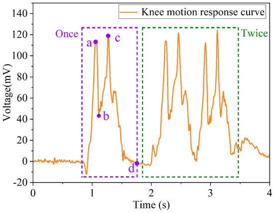 It can be seen from the response curve of the knee bend motion in Figure 20 (the purple dashed box) that when the tester performs the first-stage motion, the response voltage of the sensor gradually increases to point a, and the response voltage rapidly drops to point b; when the tester performs the second-stage motion, the response voltage rapidly rises from point b to point c. After completing the knee bend motion, the response voltage recovered from point c to the initial state (point d). When the tester performs two consecutive knee bend motion tests, the response voltage curve (the green dashed box in Figure 20) of the sensor is almost consistent with the variation characteristics of the one knee bend motion, which indicates that the sensor has a fast response capability and fairly good repeatability. The experimental results imply that the flexible sensor has very good application prospects in the motion state detection field.