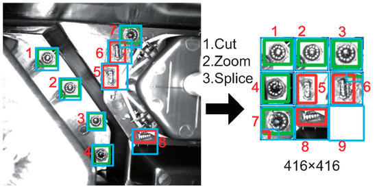 An attention mechanism focuses on modeling the relationship between the input and the output of the algorithm, regardless of distance [22]. For defect inspection, the camera angles of industrial cameras are relatively fixed. So, we can predefine the possible defect regions and extract features only from the specific region. The self-attention mechanism calculates the sequence semantic representation by associating different positions in the sequence. We add the image preprocessing equivalent to adding a self-attention mechanism to YOLOv3 preprocessing. CZS operations are as shown in Figure 2. The blue box represents the cutting region, and the green box and the red box represent two kinds of defect markup regions. Color boxes numbered 1 to 8 in the original image on the left side correspond to the splicing regions of the image on the right side. All color boxes are the main areas of concern for defect detection. The entire process involved three steps: cut predefined regions from the original image, zoom regions to the same size and splice regions together to form a new image—named CZS operations for short.