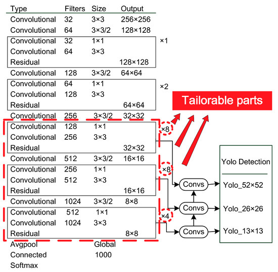 Figure 3. YOLOv3 backbone network and tailorable parts.