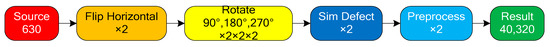The use of a dataset enhancement strategy is not only to improve the quality of training, but also to effectively reduce manpower consumption. In this study, there are only 630 original photos, which can only be manually added to the defect markup region. Then, a python script can be used to automatically complete image preprocessing and dataset enhancement, so that the final dataset size for training and testing reaches 40,320 photos.