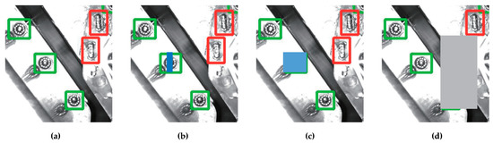 Strategy 1: It is to add random noise to the defect markup region of the original image, which changes from normal to noisy or faulty. As shown in Figure 5, the rectangular cover is used to simulate the noise or missing faults on the surface of the markup region. The position, size and color can be set randomly. From left to right, Figure 5a is normal; Figure 5b uses a rectangle to cover 1/3 region of a markup region, which is equivalent to adding some noise, so it should be ensured that the network training can recognize such markup region; Figure 5c,d completely cover one or two markup regions with rectangles to simulate the missing faults.