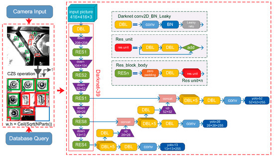 The if (condition) statement is the basic conditional control structure. This allows the tailor function to happen, depending on whether a given condition is true. The tailor function is used to delete part of the input argument network used to identify a certain scale. The yolo52×52 is the smallest resolution inspection network part of YOLOv3, while the yolo13×13 represents the largest resolution network part. The every function means every inspected target. The N represents the full amount of the inspected targets on an image. The wi and hi represent the width and height of a target. The W and H represent an image’s width and height.