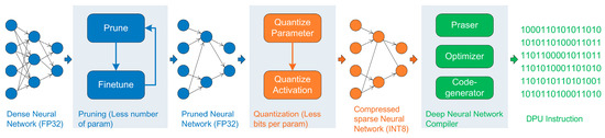 Deployment involves two parts, host-side deployment and FPGA-side deployment. On the FPGA side, we adopt the system version of the intelligent car hydramini, the essence of which is a customized DPU platform for PYNQ-Z2. The host side is the computer side. The host side needs to install the deep learning development platform, as well as the DNNDK 3.0. DNNDK is necessary for converting a standard deep learning model into a deployable model on PYNQ-Z2. DNNDK’s core functions include pruning, quantization and compiling. As shown in Figure 9, the blue flowchart represents the pruning operation, the orange flow chart represents quantization operation, and the green flowchart represents the compiler.