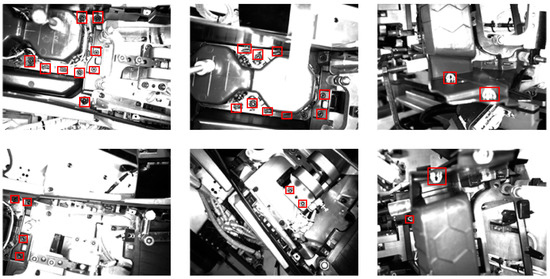 The case study gets experimental data from an automobile rubber and plastic parts manufacturer, which is a super class parts supplier for several well-known automobile brands in China, such as SAIC GM Wuling and FAW Volkswagen. Therefore, success in implementing the application system will have significance in the whole auto parts industry. With the help of industrial cameras with 10 fixed camera angles, we collected 630 photos compared with the original 63 sample photos. The photos have the same 1600 × 1200 pixels resolution and 8-bit depth. In addition, there are 16 types of defect markups. The ratio of normal and defective samples in the 630 pieces of original pictures is approximately 9:1. Several sample photos are shown in Figure 11, the red box on the pictures identify the area to be detected. The hardware of the host side mainly consists of a NVIDIA RTX3090 24 GB GPU (Nvidia Co., Silicon Valley, CA, USA), an AMD R9 3900X CPU (AMD Inc., Silicon Vallsey, CA, USA), 64 GB of DDR4 (Hynix Inc., Seoul, Korea) memory and a 4 TB mechanical hard disk (Seagate Technology, Scotts Valley, CA, USA). The software installed on the host side include Ubuntu, Compute Unified Device Architecture (CUDA) (Nvidia Co., Silicon Valley, CA, USA), Python (The Python Software Foundation, Wilmington, DE, USA), PyTorch, Tensorflow, Docker (Docker Inc., San Francisco, CA, USA) and DNNDK 3.0 (Xilinx AMD Inc., San Jose, CA, USA).