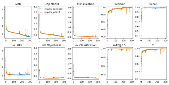 As shown in Table 1, our algorithm’s inspection time decreased by 0.004 s, and accuracy improved by 0.2%. In sum, compared with the majority of indicators, our algorithm makes an improvement to classical YOLOv3, indicating that our algorithm achieves better performance by tailoring the backbone network.