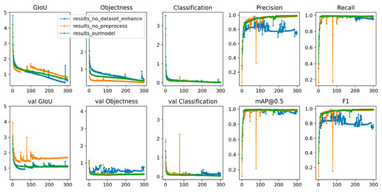 On the host workstation computer side, our algorithm, the attention-based YOLOv3, is trained. The maximum number of training epochs was initially set to 300. In the training process, the training set was composed of 36139 photos after data augmentation, at a total of 11 GB. The training process took a long time, as one round of epoch took nearly 17 min. On the other hand, precision convergence was very fast. When we finished the work after 300 epochs of training, accuracy exceeded 99%.