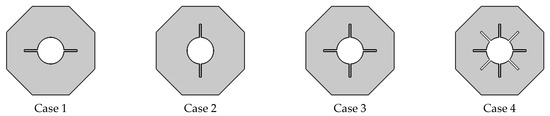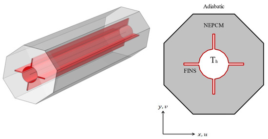 The present computational model is shown in Figure 1. The working fluid is nano-enhanced phase change material (NEPCM) consisting of copper nanoparticles and/ paraffin wax, where Table 1 includes their thermal properties. The effect of fins is investigated with four distinct configurations, as seen in Figure 2. The nano-enhanced PCM begins with a liquidus temperature of 323.15 K. The fins are kept at a high temperature (Th = 333.15 [K]), whilst the hexagonal surfaces are kept adiabatic. The circumradius of the hexagonal shell is L = 21.64 mm, and the radii of the inner circular tubes as well as the fins lengths are 6 mm.