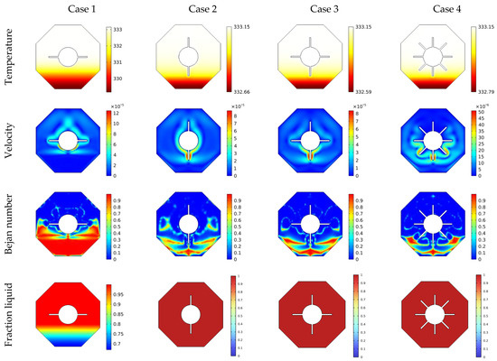 The isotherms, velocities, local Bejan number, as well as liquid fraction at different situations of inner heated are shown in Figure 4. It is worth observing that the temperature characteristics are gathered close to the fins for all instances, indicating the presence of a non-heated zone around the outer hexagon’s bottom. These temperature distributions peak in C4 (eight fins), indicating a reduction in the aforementioned non-heated area at the lower part. Additionally, it was noted that raising the number of wings reduces the temperature differences, resulting in a decrease in both gradients of the temperature and HT rate. Moreover, as the number of wings increases, a noticeable reduction of velocity values is observed. Physically, raising the number of wings enhances the complexity of the flow region, hence increasing flow resistance. In a related context, the Bejan number characteristics demonstrate that increasing the number of heated fins lowers temperature gradients, and therefore irreversibility of the fluid friction becomes higher. Additionally, the mushy zone is visible at the top half of the area in all considerations, and the heated fins numbers increase the melted region.