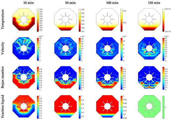 At low time values, isotherms, velocities, and the liquid fraction are seen close to the inner heated parts, while time progression results in the formation of a suitable temperature and melting of flow hexagons.