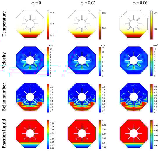 The isotherms, velocities, local Bejan number, and liquid fraction distributions are shown in Figure 6 as a function of the NP concentrations. In this situation, outer hexagons, including four fins, are employed. It is noticed that with increases in the mixture’s viscosity, there is a decrease in convective transport. The findings suggest that the velocity and temperature gradients reduce as it grows. Additionally, with low values of , the domain Bejan number occurs close to the wings rather than the lower borders. On the contrary, increasing increases the mushy region inside the active flow area until it demonstrates entirely melted behaviors at . Major changes in the values of the velocity and melting features can be noted as increases. Here, the value gives a higher velocity and melting process compared to other values of .