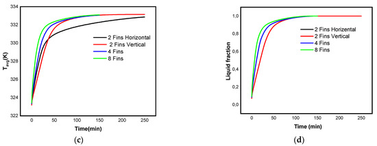 Behaviors of (a) , (b) , (c) , and (d) liquid fraction for various cases of the inner fins.
