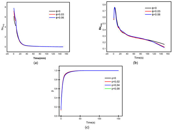 Figure 7 and Figure 8 depict the liquid fraction mean values, means Bejan number Beavg, and mean Nusselt coefficient Nuavg profiles for the impact of the heated fins count, time parameter, and NP concentration parameter. The findings indicated to C4, which assumes eight heated fins, resulted in the higher mean liquid fraction behaviors. Moreover, when the issue of heated fins increases, the mean Bejan and Nusselt values decline. In addition, the mean rate of heat transmission decreases as the temperature gradients lessen. Furthermore, the higher values result in a greater dominance of heat transfer irreversibility over fluid friction irreversibility. Finally, it was noted that enhancing the volume fraction parameter increases the mushy zone, resulting in an increase in the average liquid fraction.