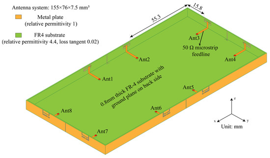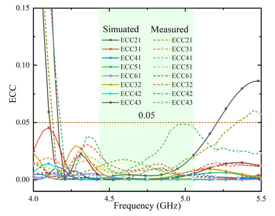 Therefore, some antenna elements (Ant 1 and Ant 2, Ant 1 and Ant 3, Ant 1 and Ant 4, Ant 1 and Ant 5, Ant 1 and Ant 6, Ant 2 and Ant 3, Ant 2 and Ant 4, and Ant 3 and Ant 4) with similar positions and strong radiation interference, were simulated and tested. The ECC values between these antenna elements can be calculated according to the calculation Equation (1) [24]: