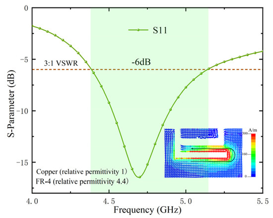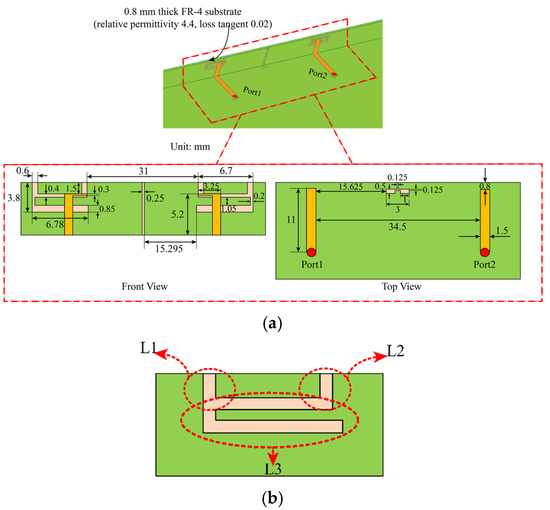 The planar structure and detailed dimensions of the proposed adjacent antenna elements are shown in Figure 2a. Inverted-F antennas (IFAS) are widely used in terminal antennas due to their small size. Based on the principle of transmission line, we have assumed that the entire length of L3 is close to the λ/4 electrical length, which excites resonance and produces an impedance bandwidth. L3 is shown in Figure 2b. To verify this hypothesis, we tried to etch the inverted F-shaped folded groove on the metal frame and used the inverted L-shaped microstrip line for feeding to transfer the energy into the inverted-F groove by coupling. Plus, the resonance was successfully excited to form the impedance bandwidth required. The resonant surface currents and the reflection coefficients of the simulated antenna elements are shown in Figure 3. It is clear that the resonant surface current is mainly distributed along with the L3 slot of the IFA slot. This result is consistent with the hypothesis.