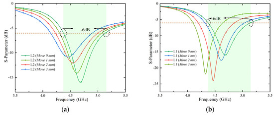 In addition, the effect of the distance between the two short slots (L1 and L2) on the impedance bandwidth has been studied, as shown in Figure 2b. The result in Figure 4a shows that moving L2 to the right will lower the frequency and reduce the impedance matching. Figure 4b shows that moving L1 to the left also lowers the frequency. The two simulation results show that the resonance length of L3 can be changed by adjusting the distance of L1 and L2, and that the resonance frequency can be shifted. By comparing the simulation results, the effect is the best when the distance between L1 and L2 is shown in Figure 2a front view. The target of our proposed IFAS is to cover the 4.4~5.0 GHz operating bandwidth.