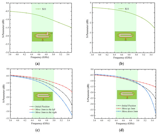 Simulation results. (a): Reflection coefficients without L1, (b): reflection coefficients without L1 and L2, (c): the reflection coefficients obtained after moving the feeding line to the left and right, respectively, and (d): the reflection coefficient obtained after moving the feeding line up and down, respectively.