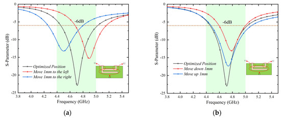 Simulation results with L1 and L2. (a): The reflection coefficients obtained after moving the feeding line to the left and right, respectively, and (b): the reflection coefficients obtained after moving the feeding line up and down, respectively.