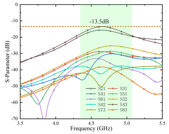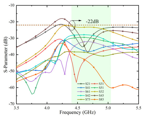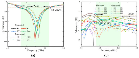 The simulated and measured S-parameter (reflection coefficient) results are given in Figure 13a. Due to manufacturing tolerances, the measured bandwidth is slightly offset, but the overall measurement results are satisfying. The measured impedance bandwidth can reach 12.7% within the acceptable range and the center frequency shifted to 4.82 GHz. The transmission coefficients between some ports (1 and 2, 1 and 3, 1 and 4, 1 and 5, 1 and 6, 2 and 3, 2 and 4, and 3 and 4) with relatively strong coupling are shown in Figure 13b. It is worth noting that the isolation degree is 2 dB higher than the simulation result because it is very difficult to weld the metal frame and the ground plane of the mainboard when the MIMO antenna system is manufactured, which is some gap. Overall, the isolation level between components exceeds 22 dB in the simulated and measured frequency bands.